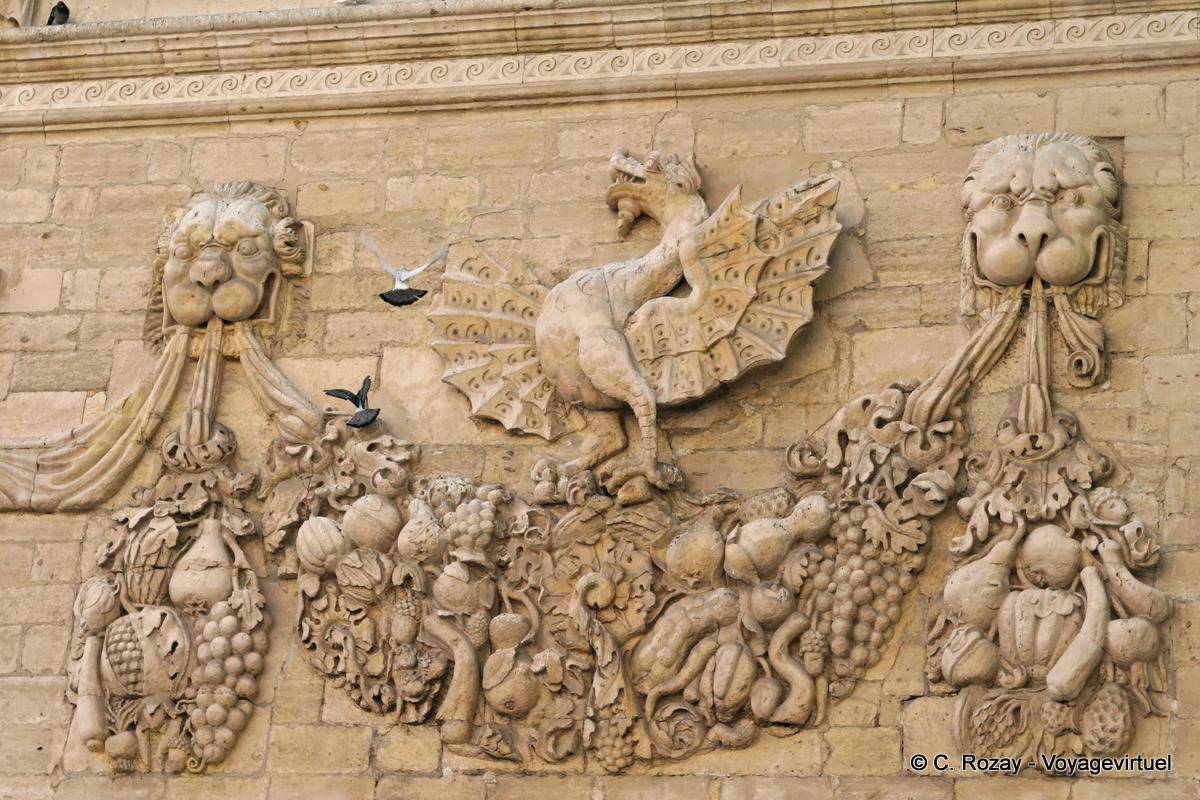 - Les armoiries de la famille Borghese, dont les meubles, l'aigle et le dragon se trouvent déclinés de part et d'autre sur d'énormes guirlandes de fruits. (France)