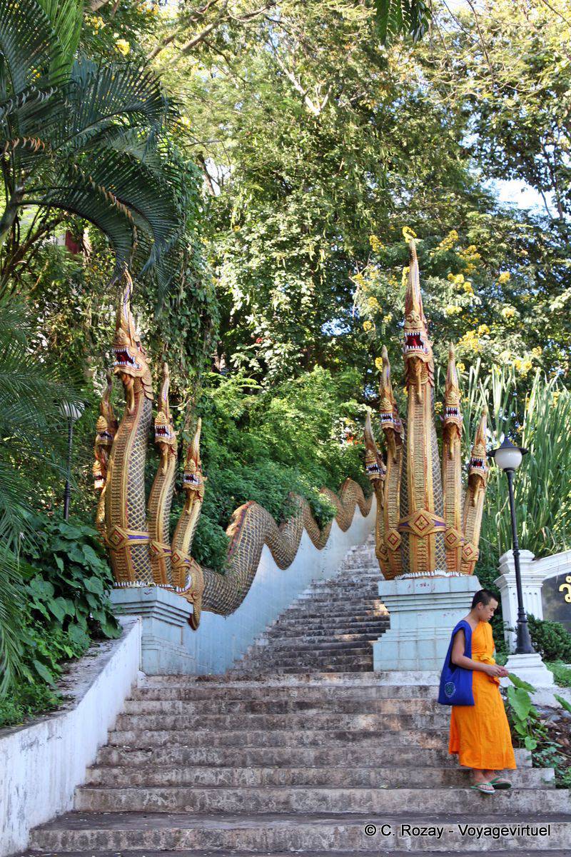 - Quintuple nagas de chaque côté de l'escalier menant à un temple depuis la route qui descend du Wat Phrathat Doi Suthep. (Claude)